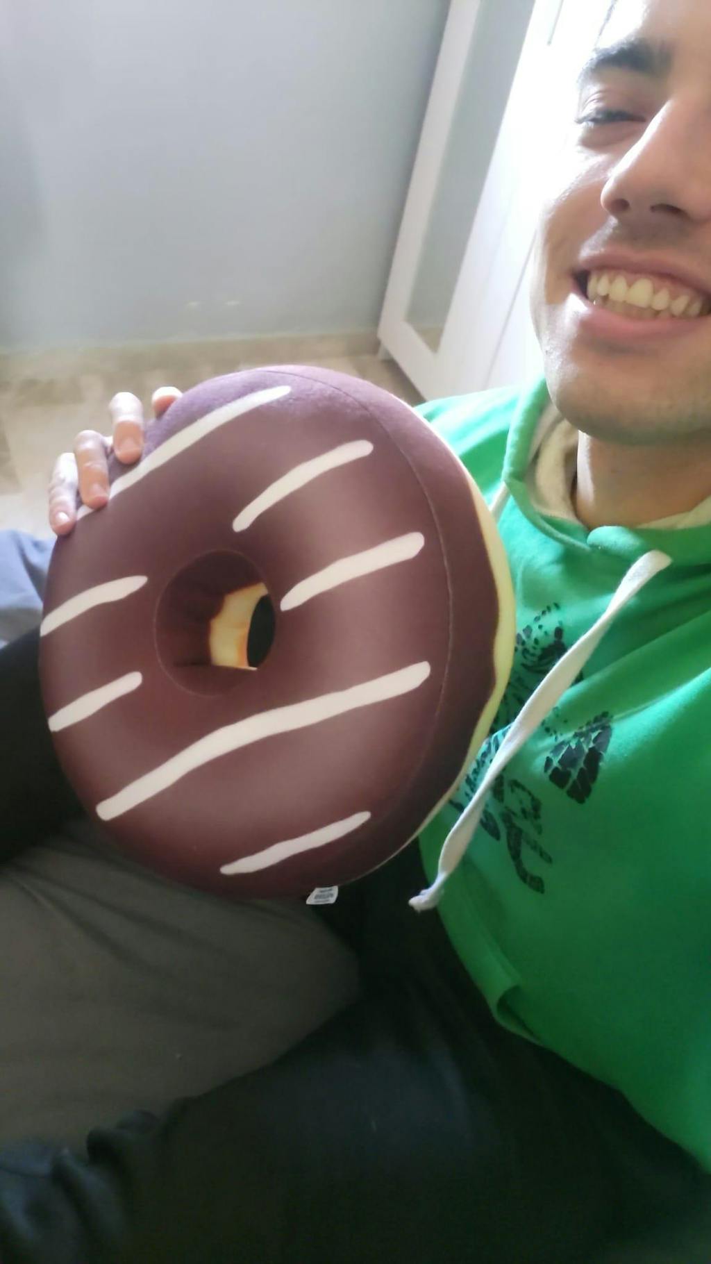 Handy size comfortable Donut Pillow with brown print Chocolate frosting.